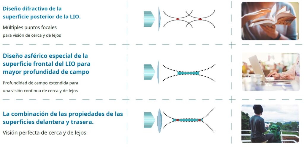 Ofrece visión para varias distancias: lejos, intermedia y cerca, gracias a su combinación de superficie EDOF anterior y óptica multifocal/difractiva posterior. Esto permite que muchos pacientes reduzcan su dependencia de gafas tras la cirugía.