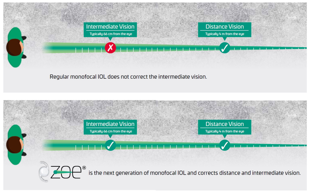 La ZOE®, gracias a su diseño óptico avanzado, proporciona también una visión intermedia nítida, manteniendo un contraste y claridad comparables a los lentes monofocales premium.